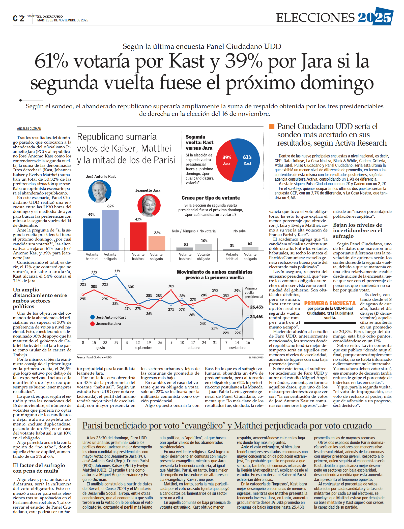 61% votaría por Kast y 39% votaría por Jara si la segunda vuelta fuese el próximo domingo.