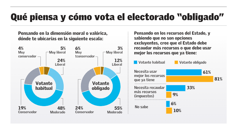 Personas que solían no votar antes de que se impusiera una multa, expresan una posición política más moderada y de derecha que quienes participan habitualmente en los comicios. Se trata de votantes distantes del poder político y con demandas asociadas a experiencias de inseguridad económica y desconfianza en el Estado.