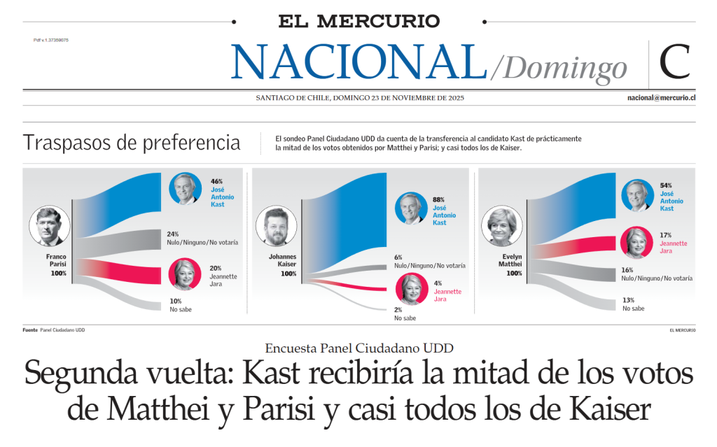 Los poco más de 2 millones y medio de sufragios obtenidos por el economista del PDG, Franco Parisi, son apetecidos por las 2 candidaturas presidenciales en competencia. En base a más de 8 mil casos, el informe Panel Ciudadano-UDD-muestra el traspaso de preferencias de Parisi, Kaiser y Matthei a Kast/Jara.