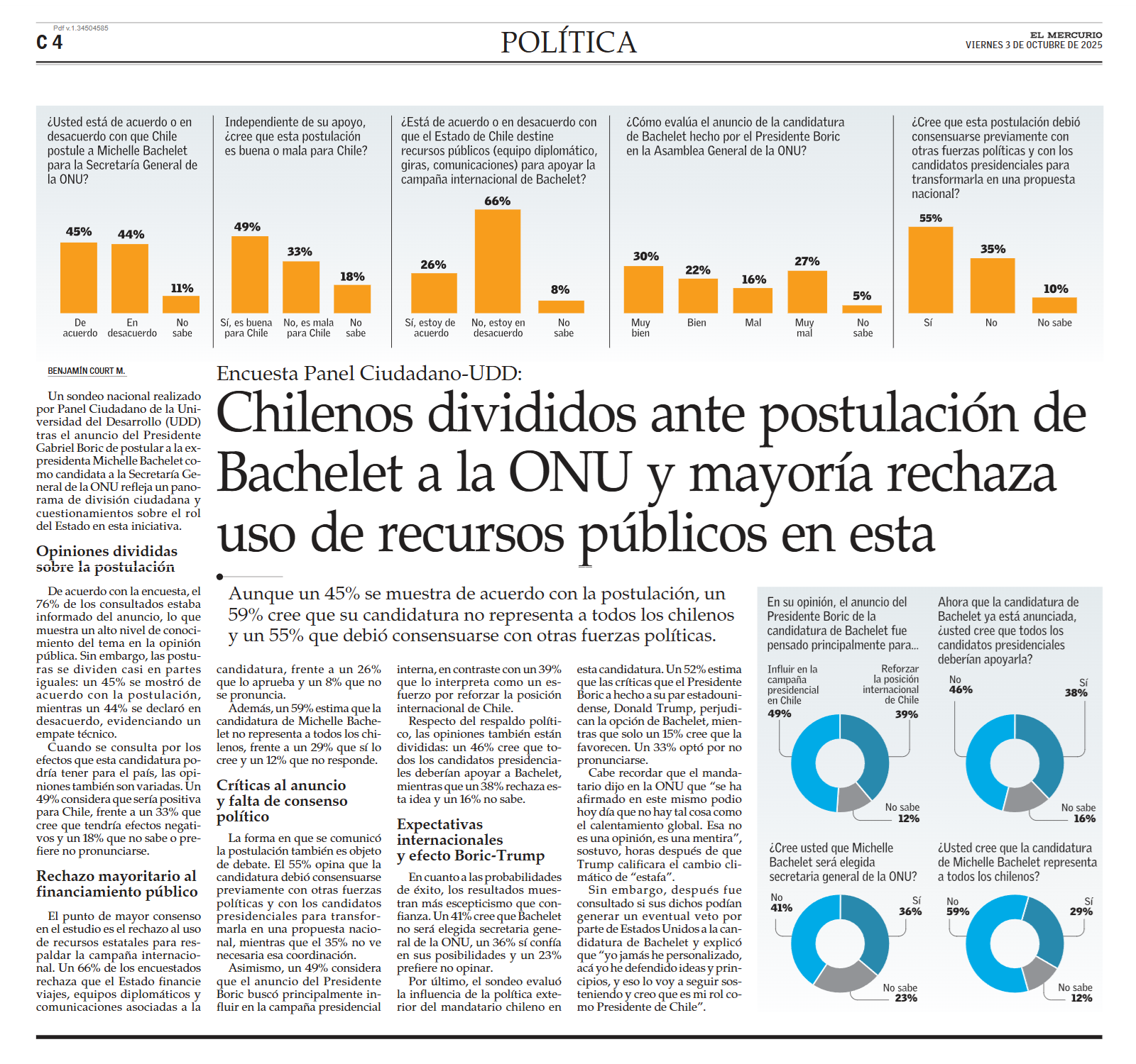 Chilenos divididos ante postulación de Bachelet a la ONU y mayoría rechaza uso de recursos públicos en esta.