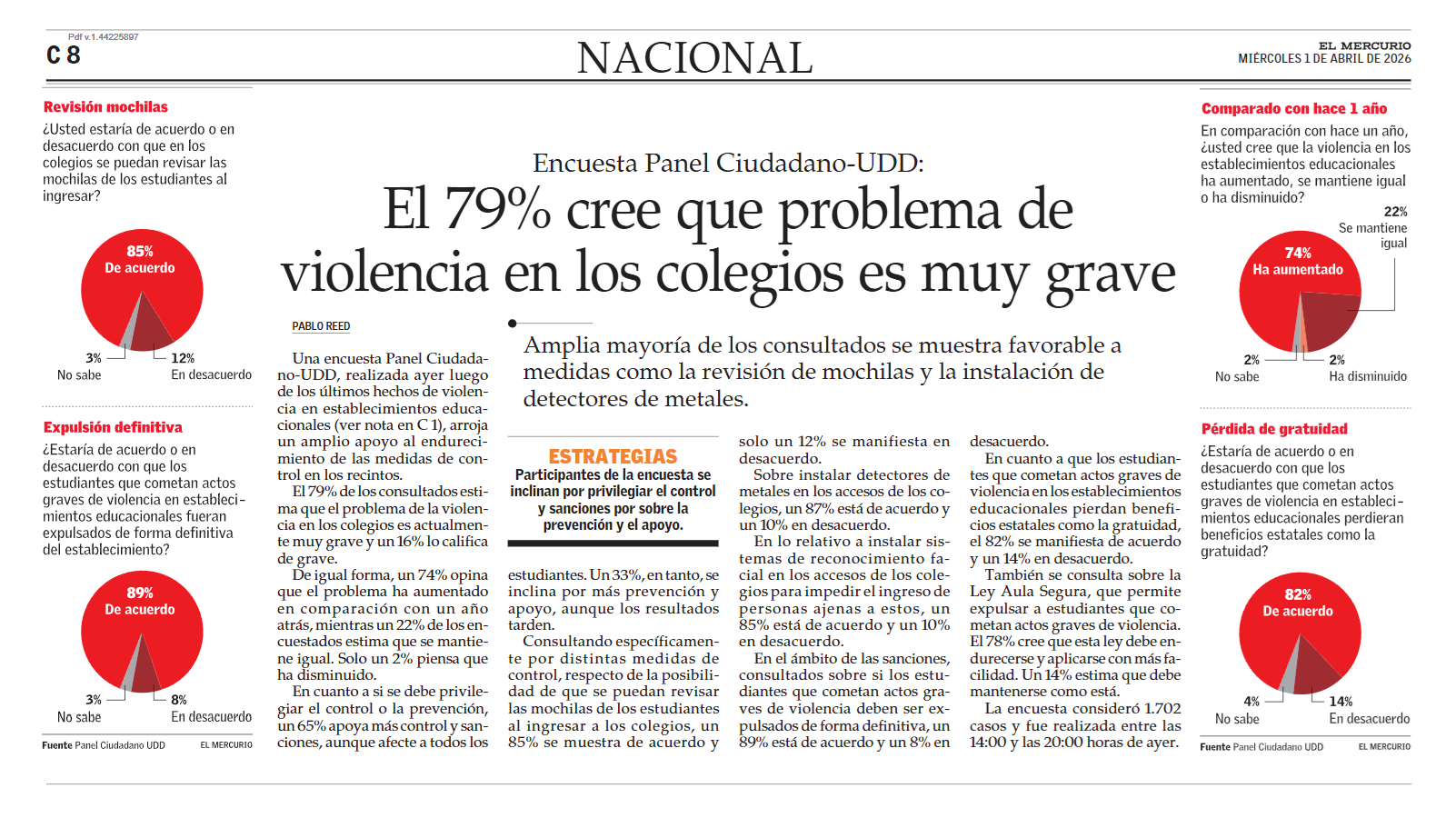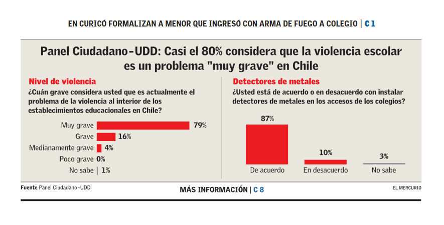 Amplia mayoría de los consultados se muestra favorable a medidas como la revisión de mochilas y la instalación de detectores de metales. Además, se inclinan por privilegiar el control y sanciones por sobre la prevención y el apoyo.