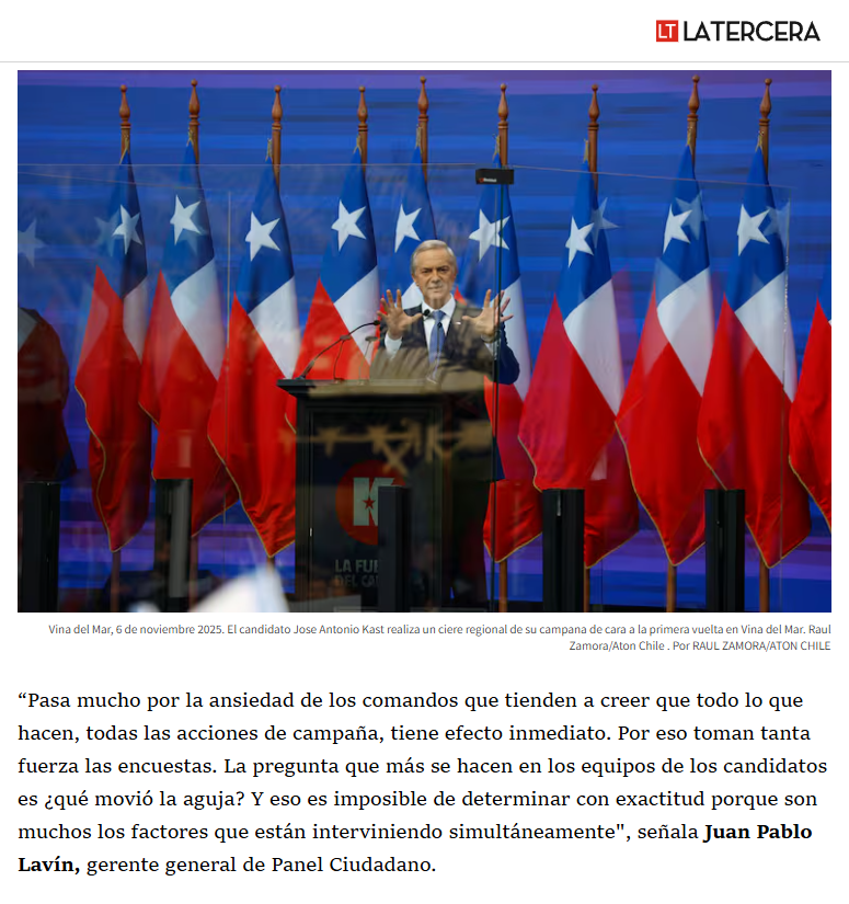 “Pasa mucho por la ansiedad de los comandos que tienden a creer que todo lo que hacen, todas las acciones de campaña, tiene efecto inmediato. Por eso toman tanta fuerza las encuestas. La pregunta que más se hacen en los equipos de los candidatos es ¿qué movió la aguja? Y eso es imposible de determinar con exactitud porque son muchos los factores que están interviniendo simultáneamente», señala Juan Pablo Lavín, gerente general de Panel Ciudadano.