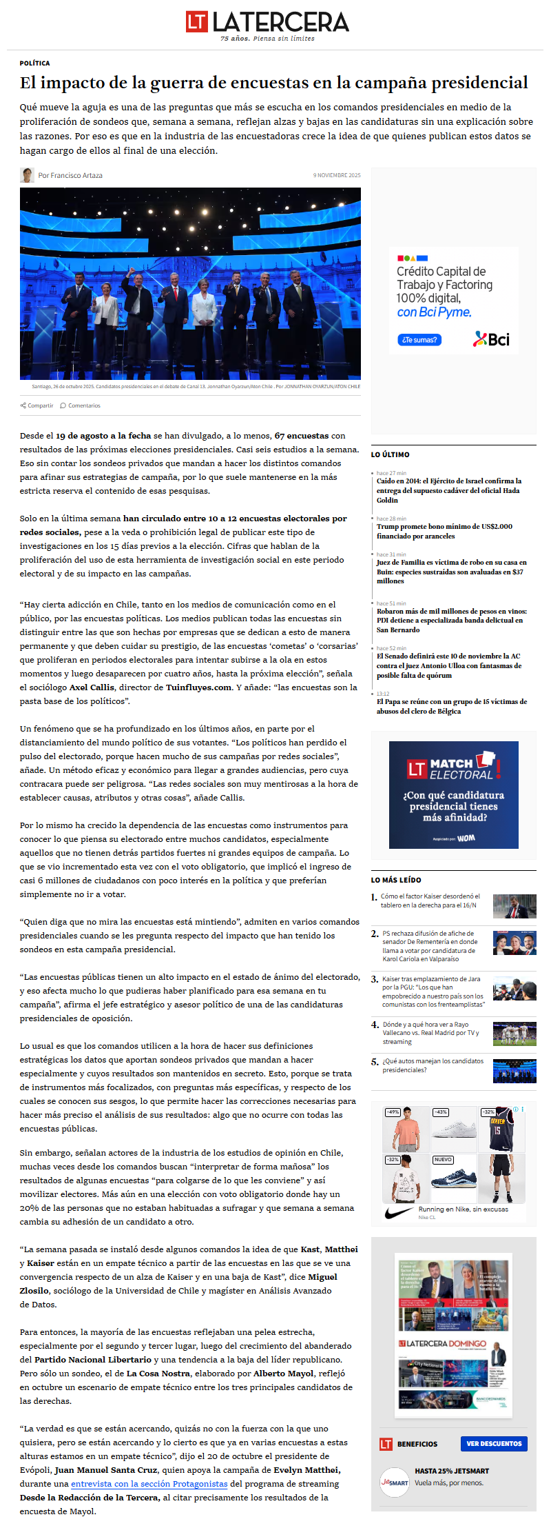 “Pasa mucho por la ansiedad de los comandos que tienden a creer que todo lo que hacen, todas las acciones de campaña, tiene efecto inmediato. Por eso toman tanta fuerza las encuestas. La pregunta que más se hacen en los equipos de los candidatos es ¿qué movió la aguja? Y eso es imposible de determinar con exactitud porque son muchos los factores que están interviniendo simultáneamente», señala Juan Pablo Lavín, gerente general de Panel Ciudadano.