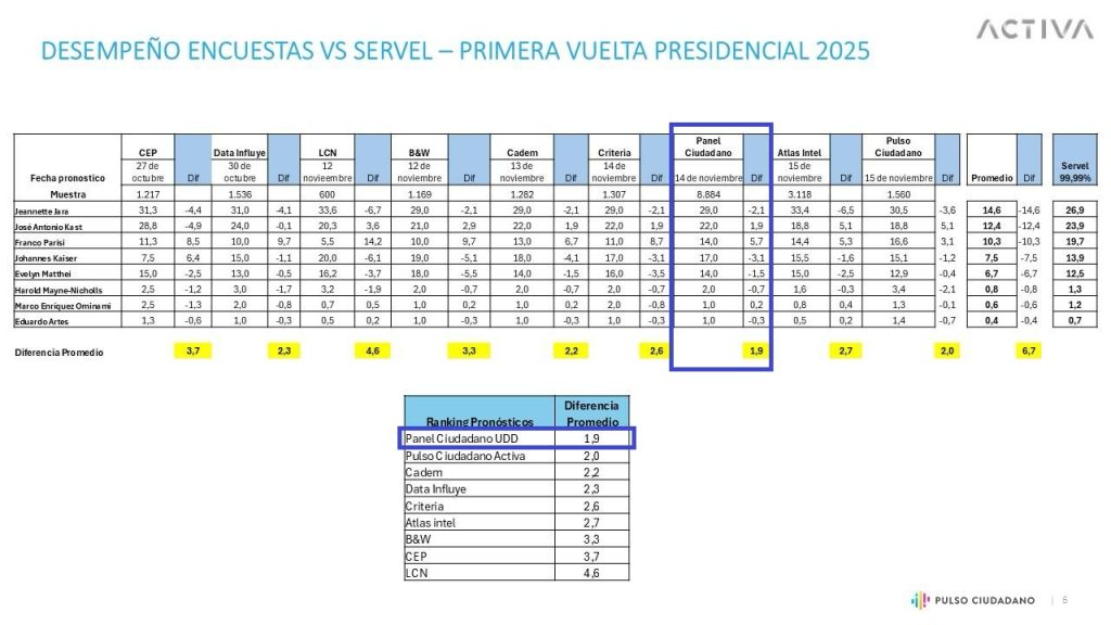 Panel Ciudadano-UDD obtuvo la menor diferencia frente al cómputo oficial, con un promedio de error de 1,9 puntos. Las principales encuestadoras tendieron a inflar la votación de Jara y a quedar cortas con Kast y Parisi, un patrón que revela un desplazamiento final del electorado.