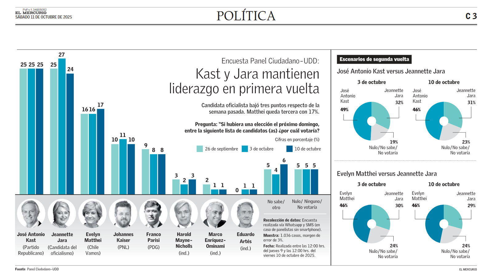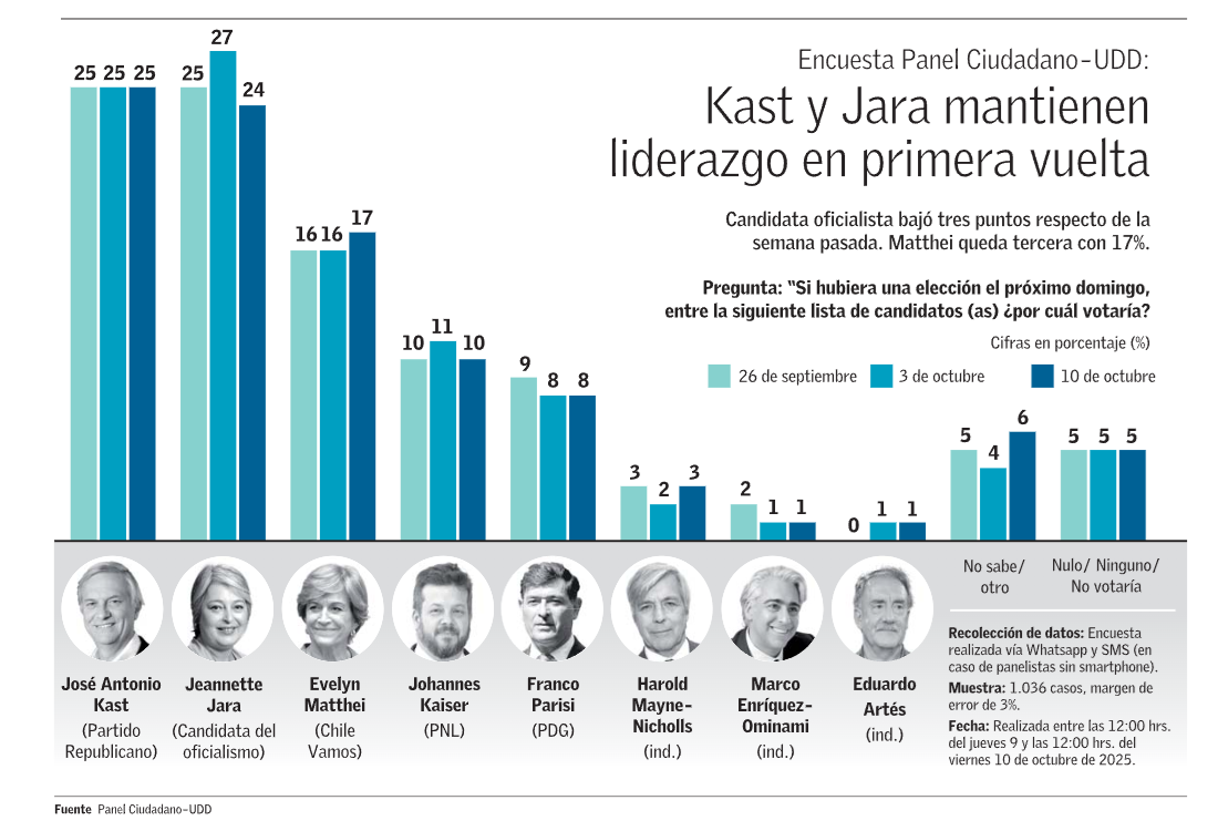 Encuesta Panel Ciudadano-UDD. Kast y Jara mantienen liderazgo en primera vuelta.