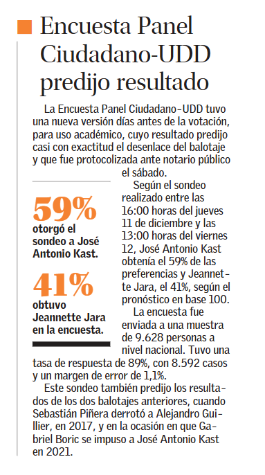 Recordar que Panel Ciudadano-UDD también predijo con bastante precisión los resultados de los 2 balotajes presidenciales previos, cuando Sebastián Piñera derrotó a Alejandro Guillier (en 2017), y en la ocasión en que Gabriel Boric se impuso a José Antonio Kast (en 2021).