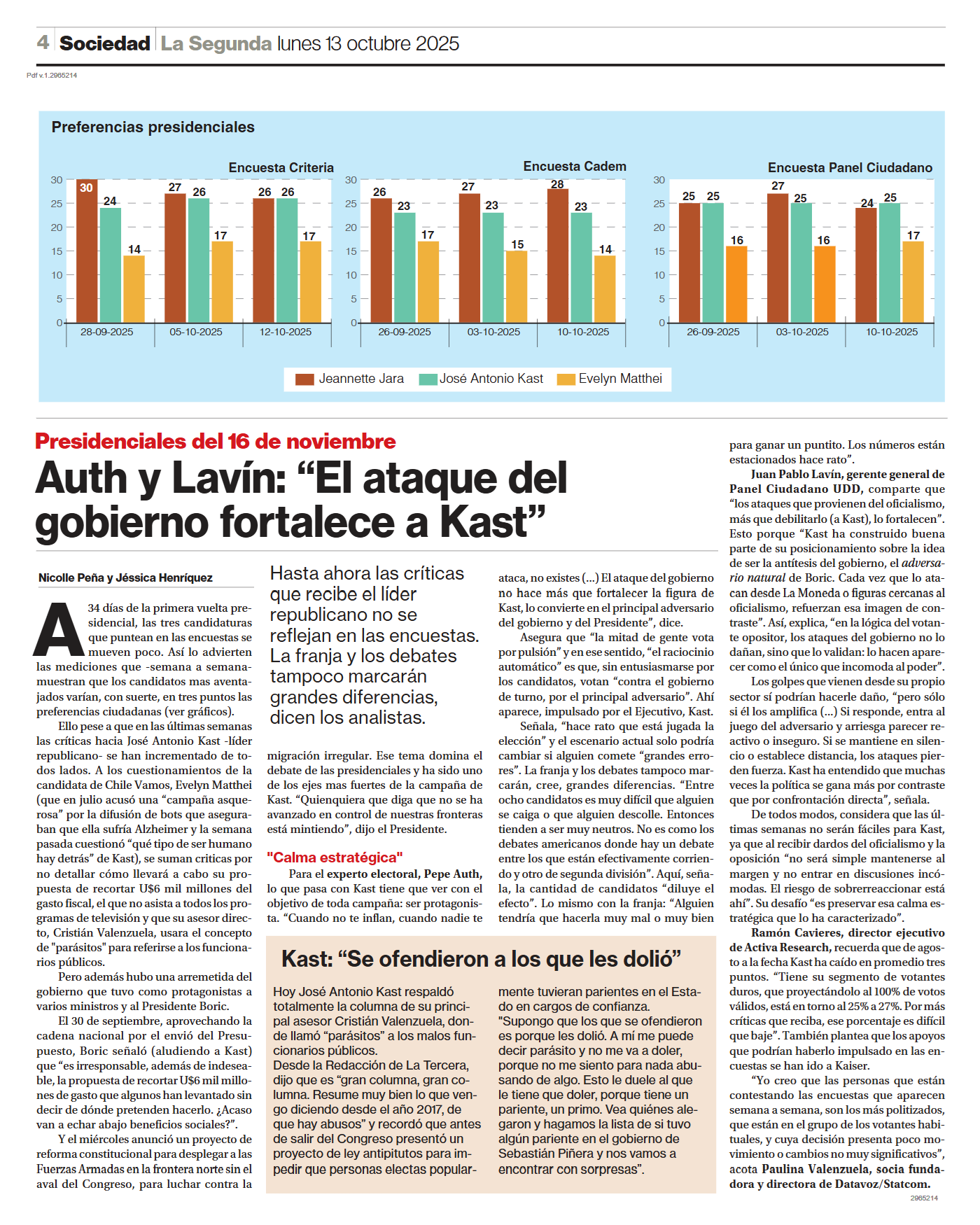 El gerente general de Panel Ciudadano-UDD comparte que «los ataques que provienen del oficialismo, más que debilitarlo (a Kast), lo fortalecen». Esto, porque «Kast ha construido buena parte de su posicionamiento sobre la idea de ser la antítesis del gobierno, el adversario natural de Boric. Cada vez que lo atacan desde la Moneda o figuras cercanas al oficialismo, refuerzan esa imagen de contraste».