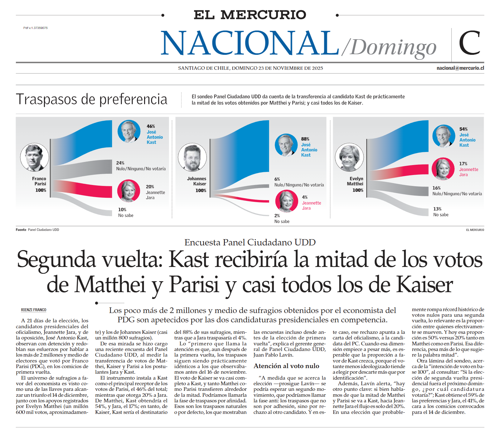 Los poco más de 2 millones y medio de sufragios obtenidos por el economista del PDG, Franco Parisi, son apetecidos por las 2 candidaturas presidenciales en competencia. En base a más de 8 mil casos, el informe Panel Ciudadano-UDD-muestra el traspaso de preferencias de Parisi, Kaiser y Matthei a Kast/Jara.